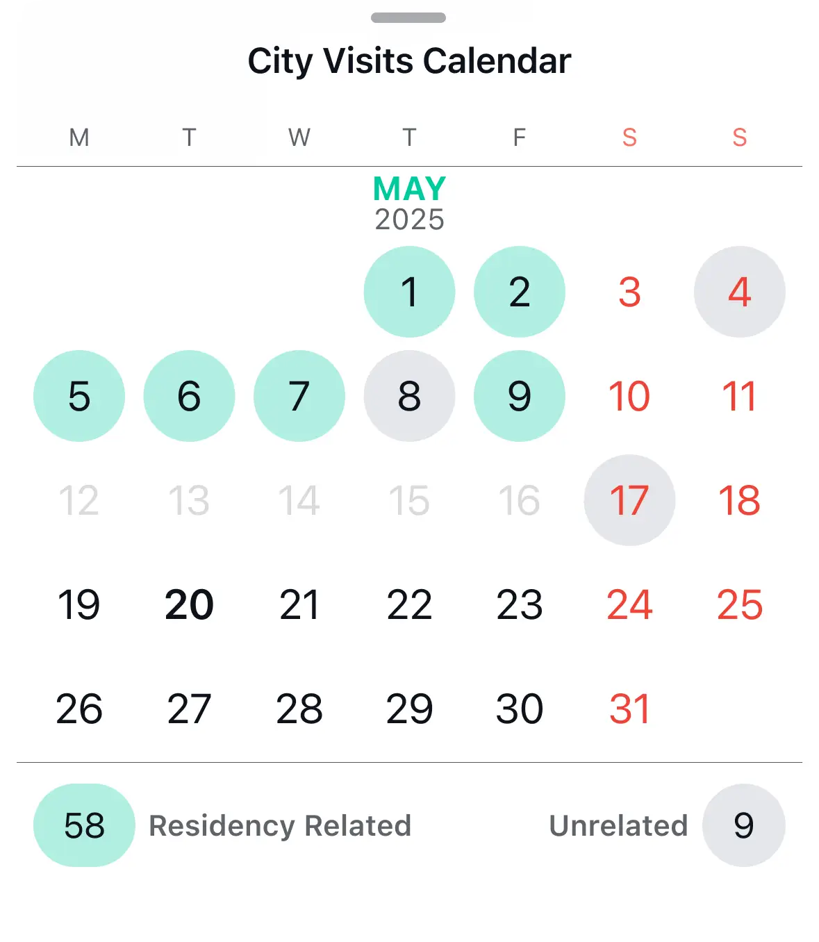 Flamingo Compliance auto-tracks your days in every US state and your workdays in key cities. You can select residency-eligible days, mark non-work days, and receive warnings as you approach residency status.