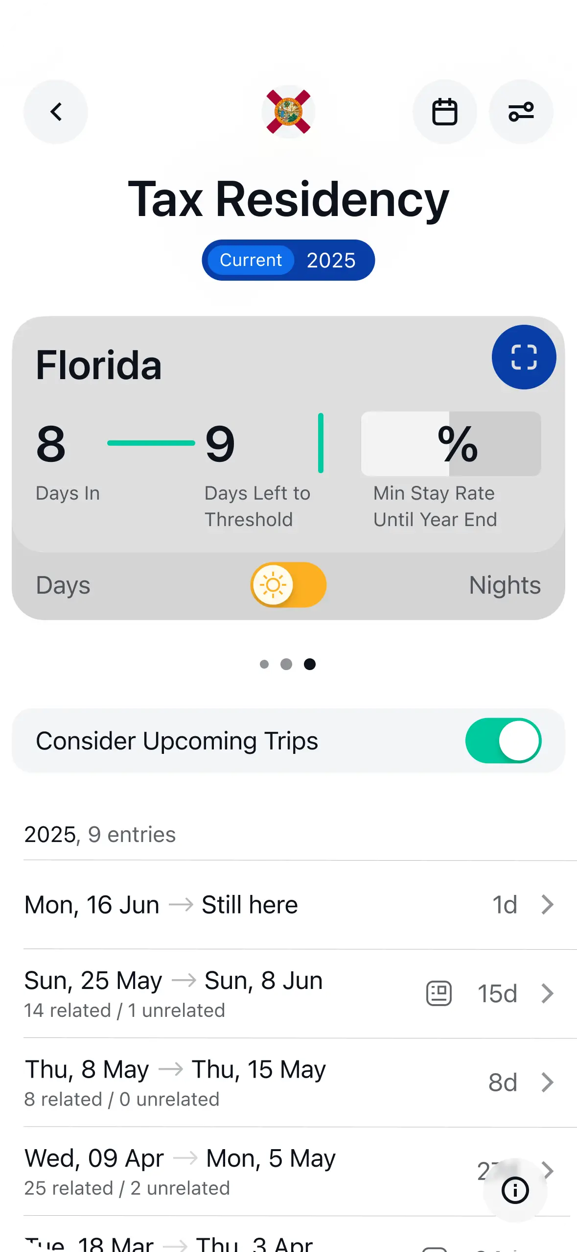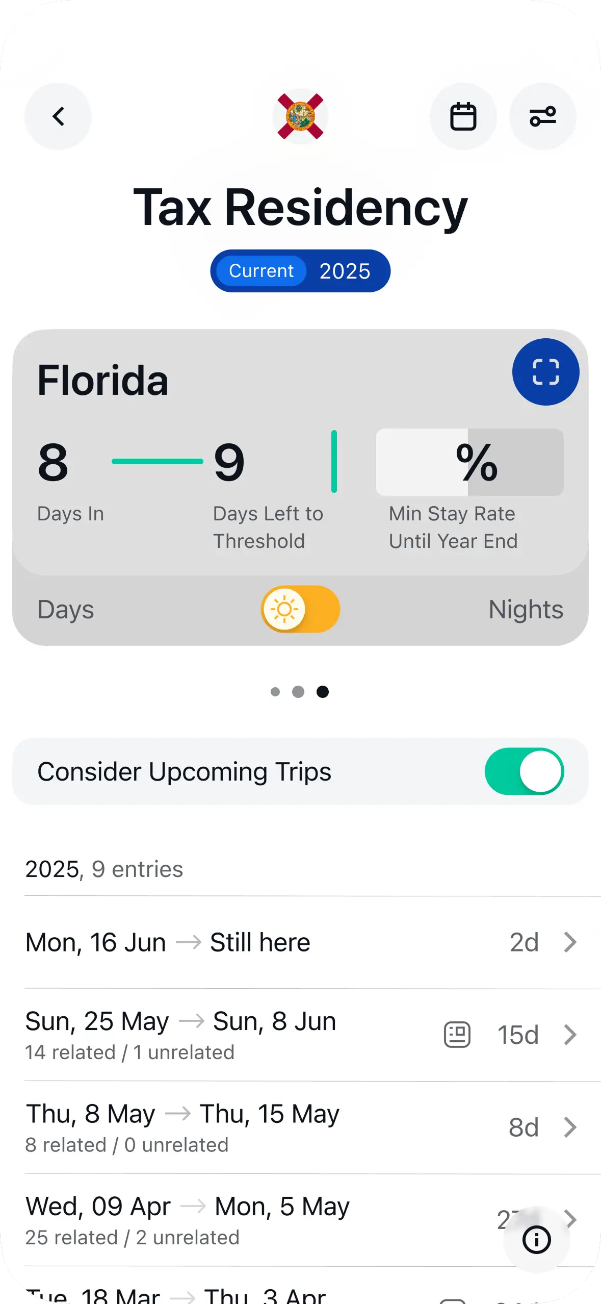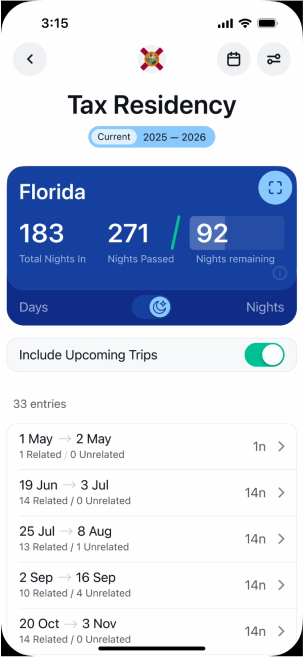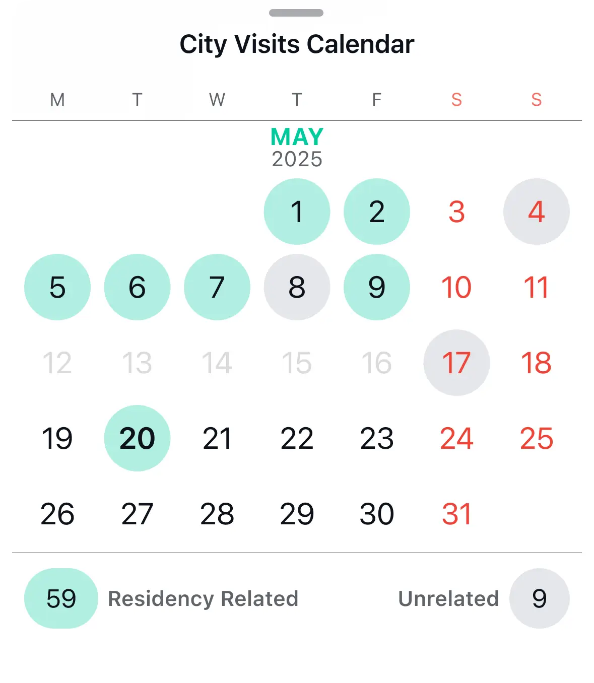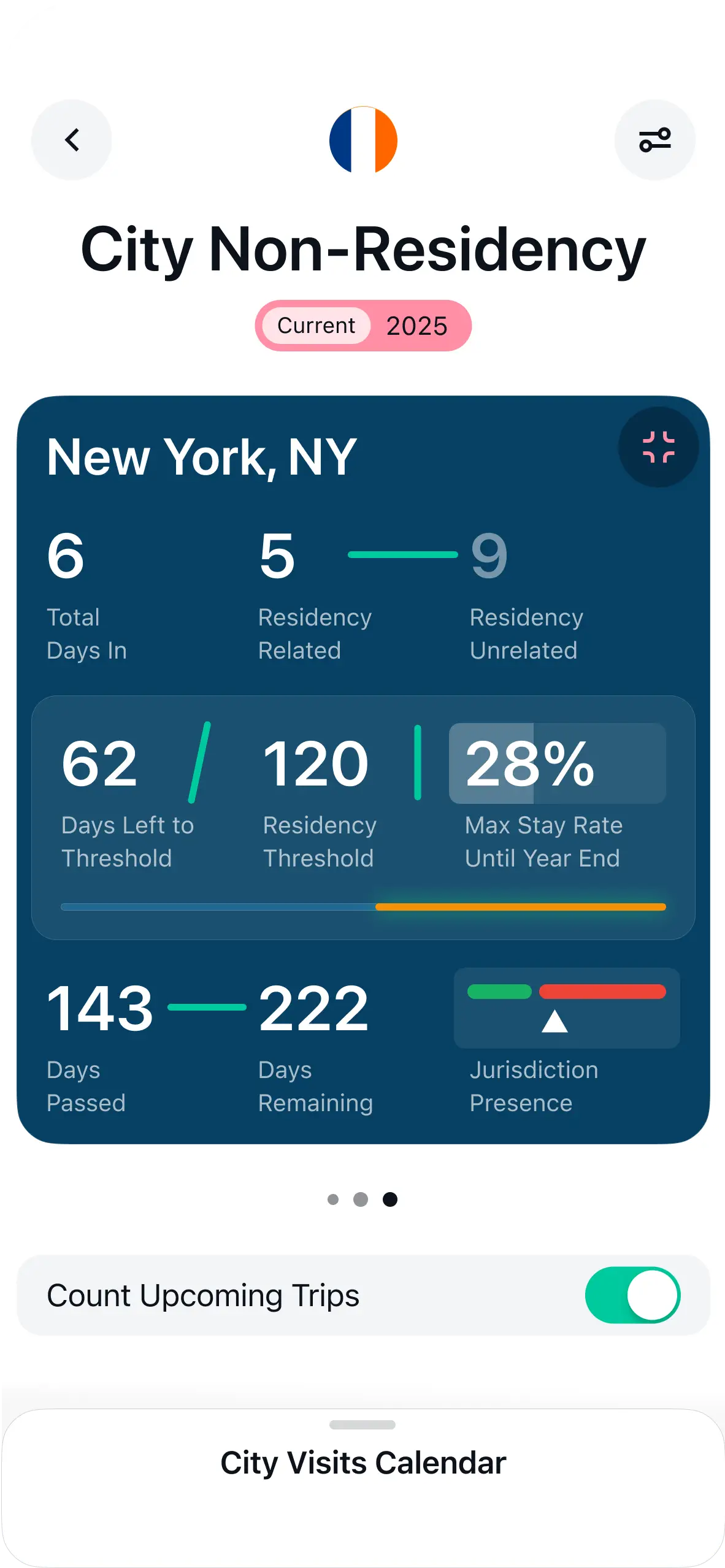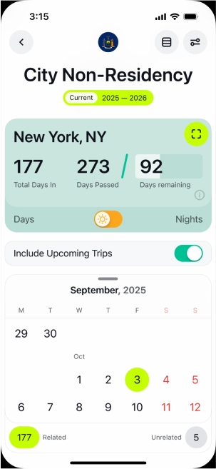 Flamingo Compliance auto-tracks your days in every US state and your workdays in key cities. You can select residency-eligible days, mark non-work days, and receive warnings as you approach residency status.