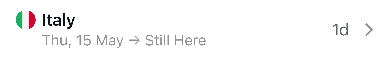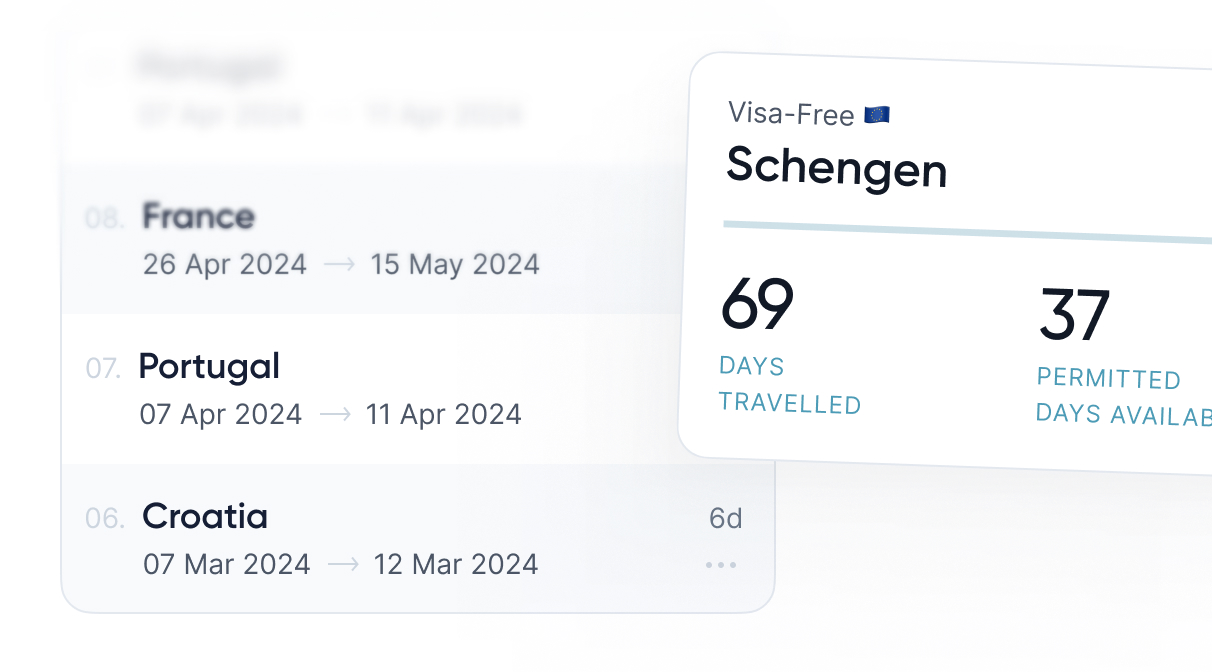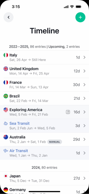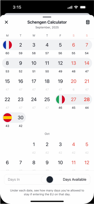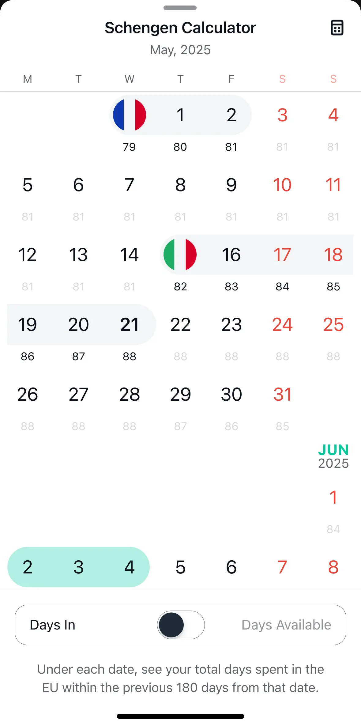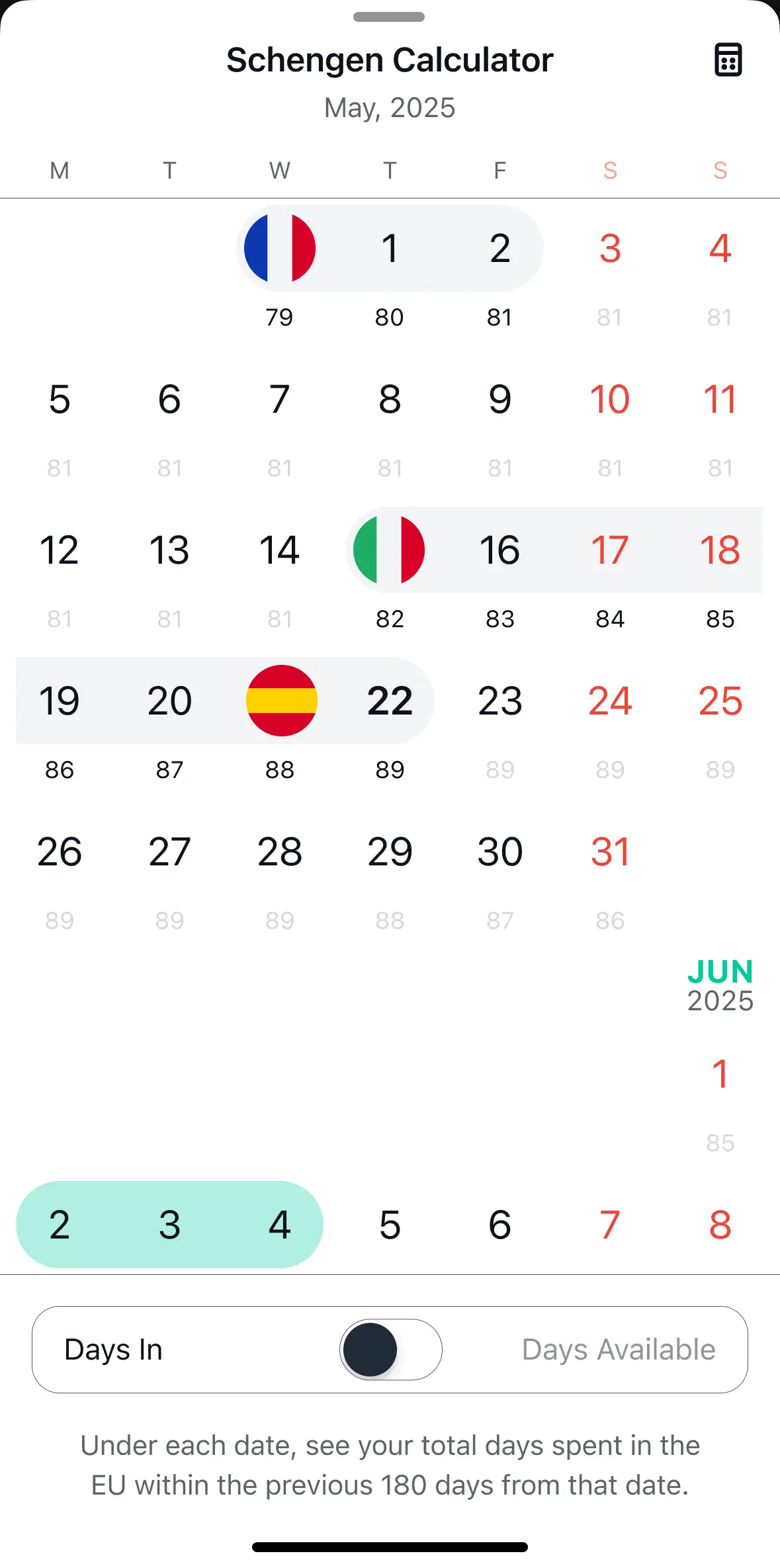 The built-in Schengen calculator uses your cumulative days spent in Schengen countries to display days you have left and allows you to plan future trips to the EU based on the 90/180 day rule.